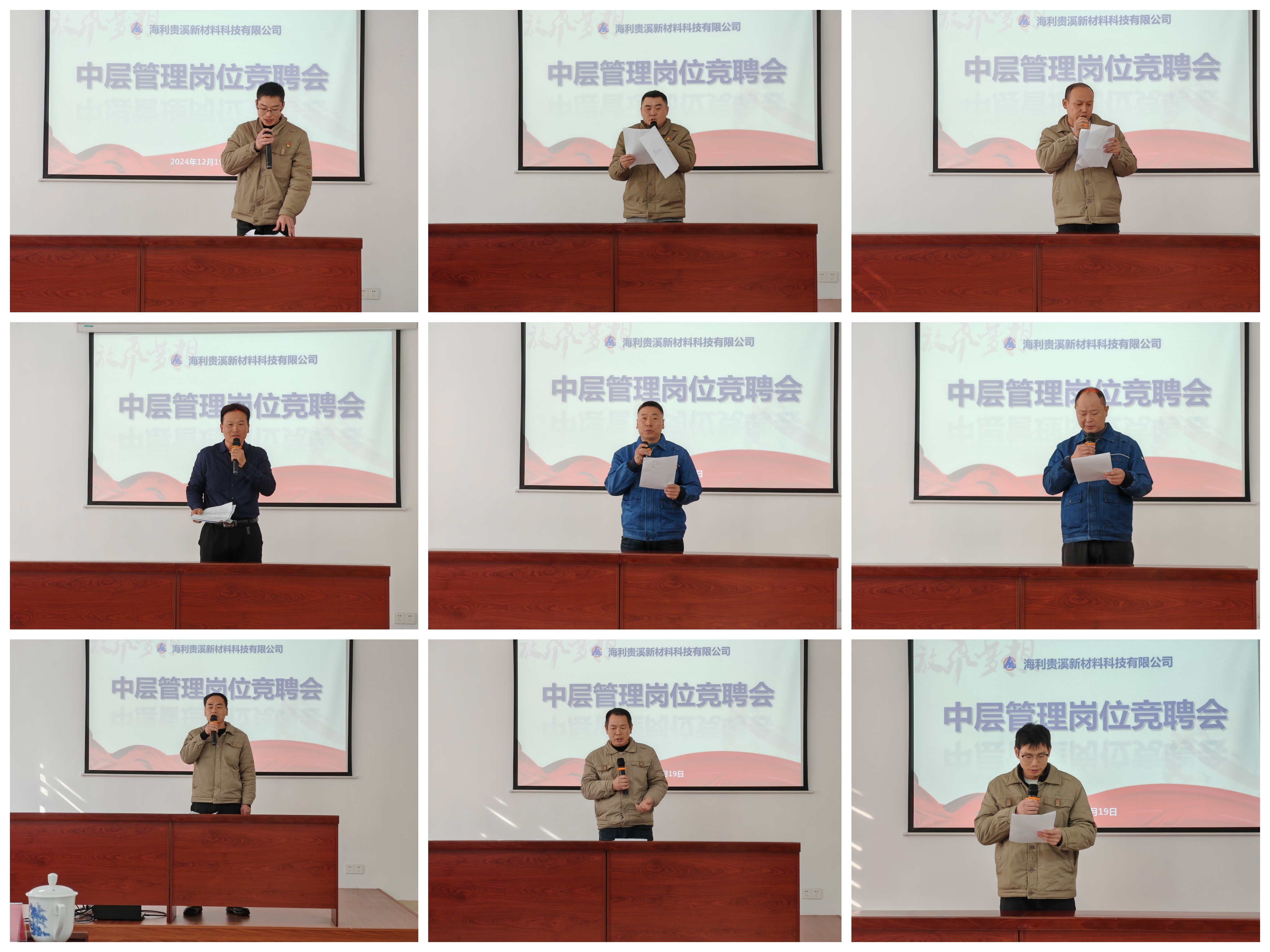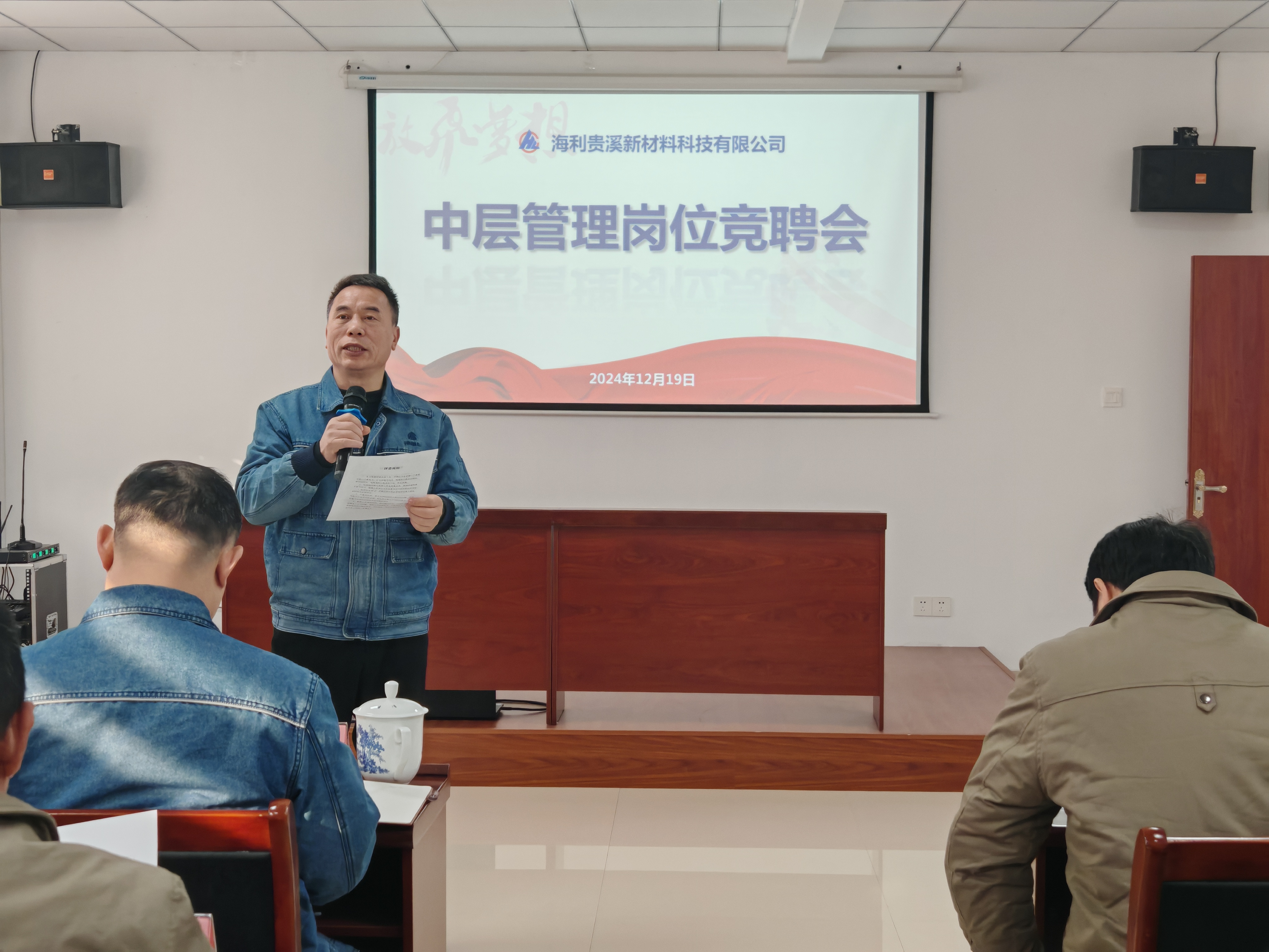 12月19日,海利贵溪公司中层管理岗位竞聘会如期召开。贵溪公司党委副书记、纪委书记雷粮林主持会议并作了动员,他指出:“公司开展中层管理岗位公开竞聘,是强化公司人才队伍建设的一部分,希望大家不断加强学习,提高自身综合能力,充分展现自我、激发活力、放飞梦想。”