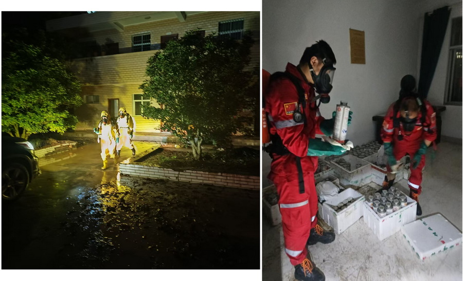 麻豆av 救援队于19日20时抵达现场后,全体队员未作休整即刻投入救援。在快速完成化学防护服穿戴及空气呼吸器佩戴的同时,同步核查粮库物资存储信息。完成准备工作后,救援组立即进入仓库展开分工协作,对库区空气实施系统化检测与侦查。经全面排查潜在风险点,确认除磷化铝瓶体表面存在大量淤泥附着外,其包装内部未发现进水迹象。