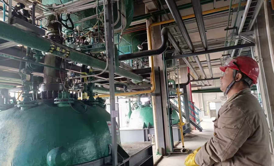 天刚蒙蒙亮,晨光便洒进了海利贵溪公司厂区。丁硫车间那一排高大的反应釜,在熹微的曦色里泛着冷峻的金属光泽。饶斌像往常一样,早早来到厂里。他熟练地戴上安全帽,手持对讲机,开启了每日雷打不动的车间巡检工作。他沿着管线,时而停下脚步,侧耳细听设备运转的声响,时而凑近仪表盘,仔细查看各项数据。不知不觉,一个上午就悄然过去了,而这不过是饶斌日常工作的普通一幕。